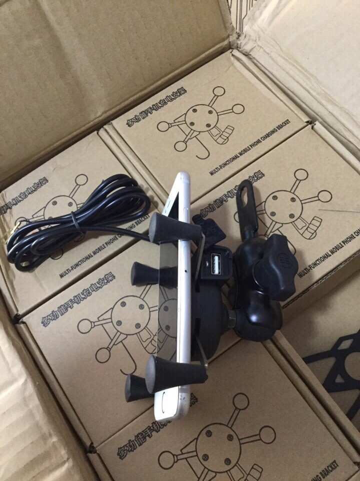 Giá đỡ điện thoại bắt vào chân kính xe gắn máy/motor kèm cốc sạc điện thoại.